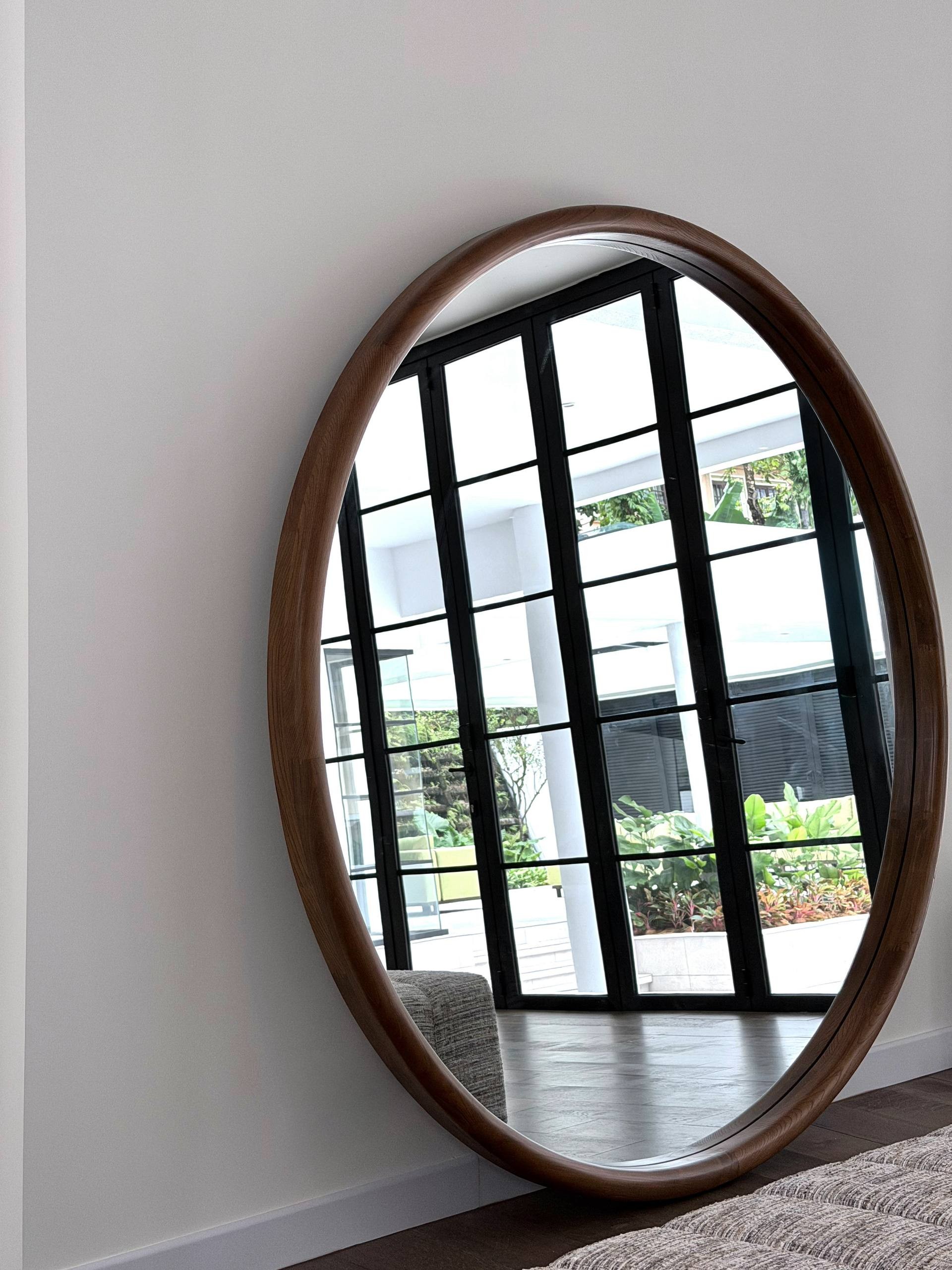 The 2000mm Polly Mirror showcases a classic circular design with a walnut-toned frame, adding quiet elegance and depth to your interior.