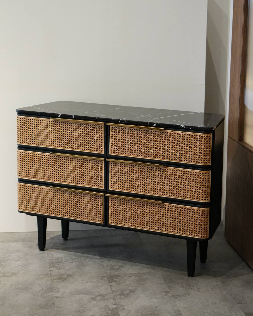 Enhance the overall aesthetic of your space with the 4' NOOI rattan sideboard, the perfect addition to complete your desired look! Crafted with an ash veneer structure, a handwoven rattan cabinet cover, stylish gold handle accents, and an elegant marble top, this exquisite piece of furniture is bound to make a statement. A must-have for Rattan enthusiasts seeking to infuse a blend of boho and modern vibes into their decor!