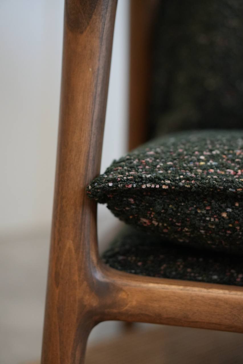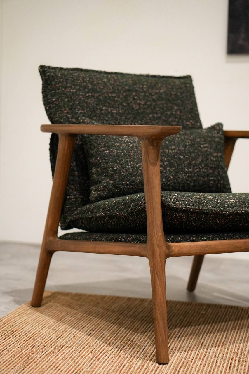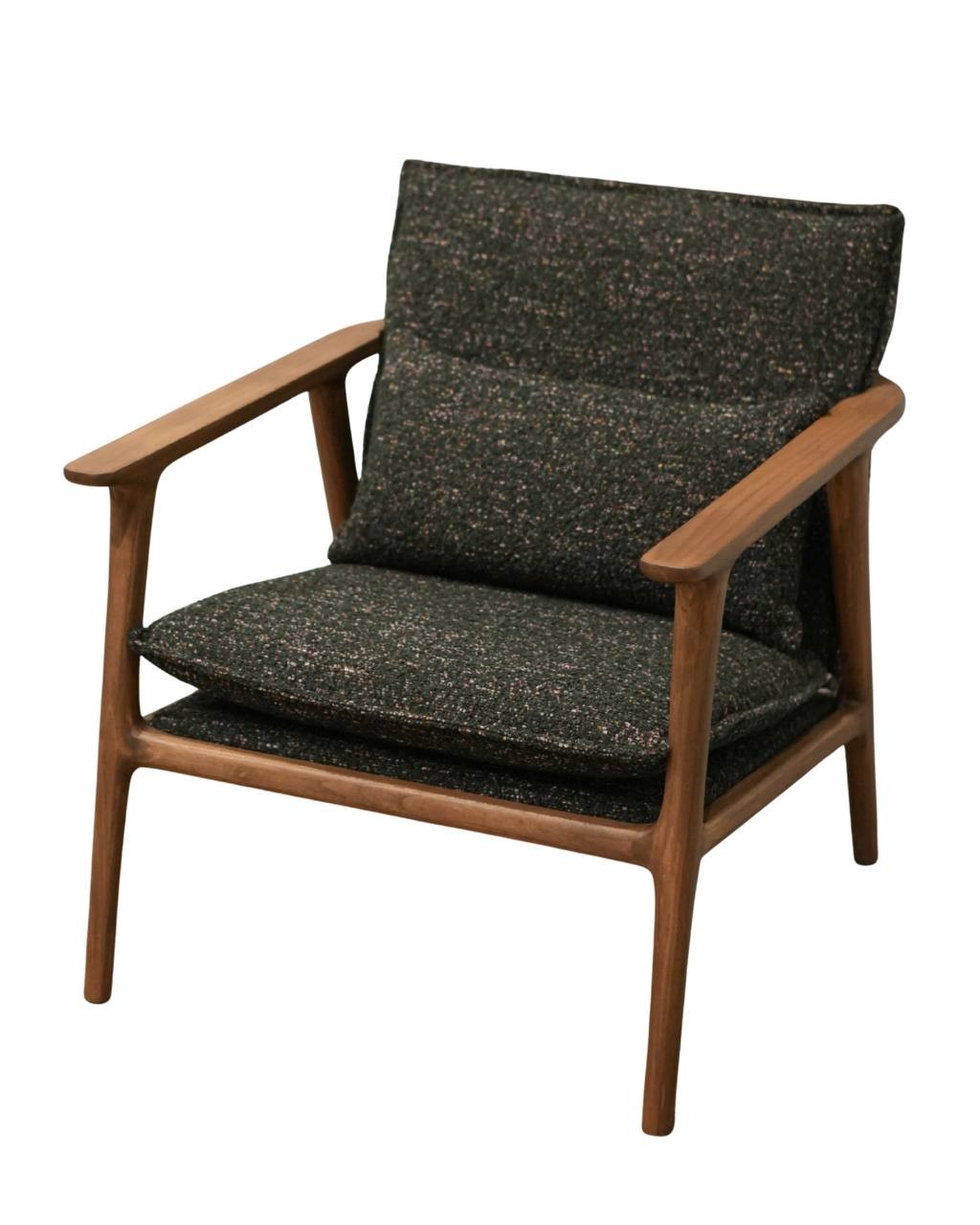 The generously cushioned seat and back are upholstered in a richly textured fabric, offering a relaxed yet supportive seating experience. Subtle curves along the armrests and frame soften the overall silhouette, allowing the chair to sit effortlessly within contemporary, modern, and mid-century inspired interiors.