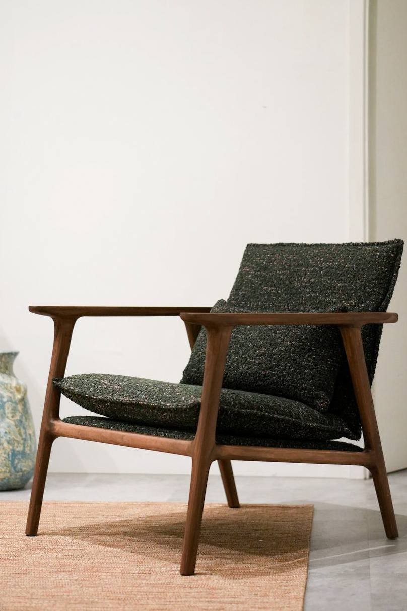 The Cascade Lounge Chair presents a quiet confidence through its balanced proportions and honest materials, making it a refined choice for modern interiors in Malaysia. Crafted with a solid wood frame in a warm walnut finish, its gently angled armrests and tapered legs create a light, architectural presence while maintaining a grounded and stable form.