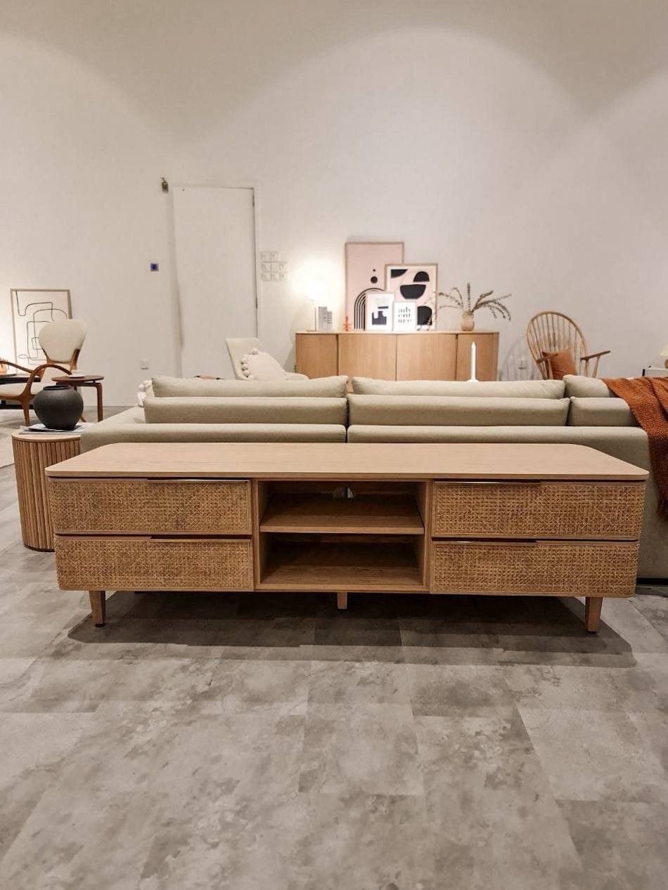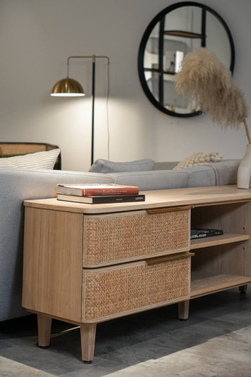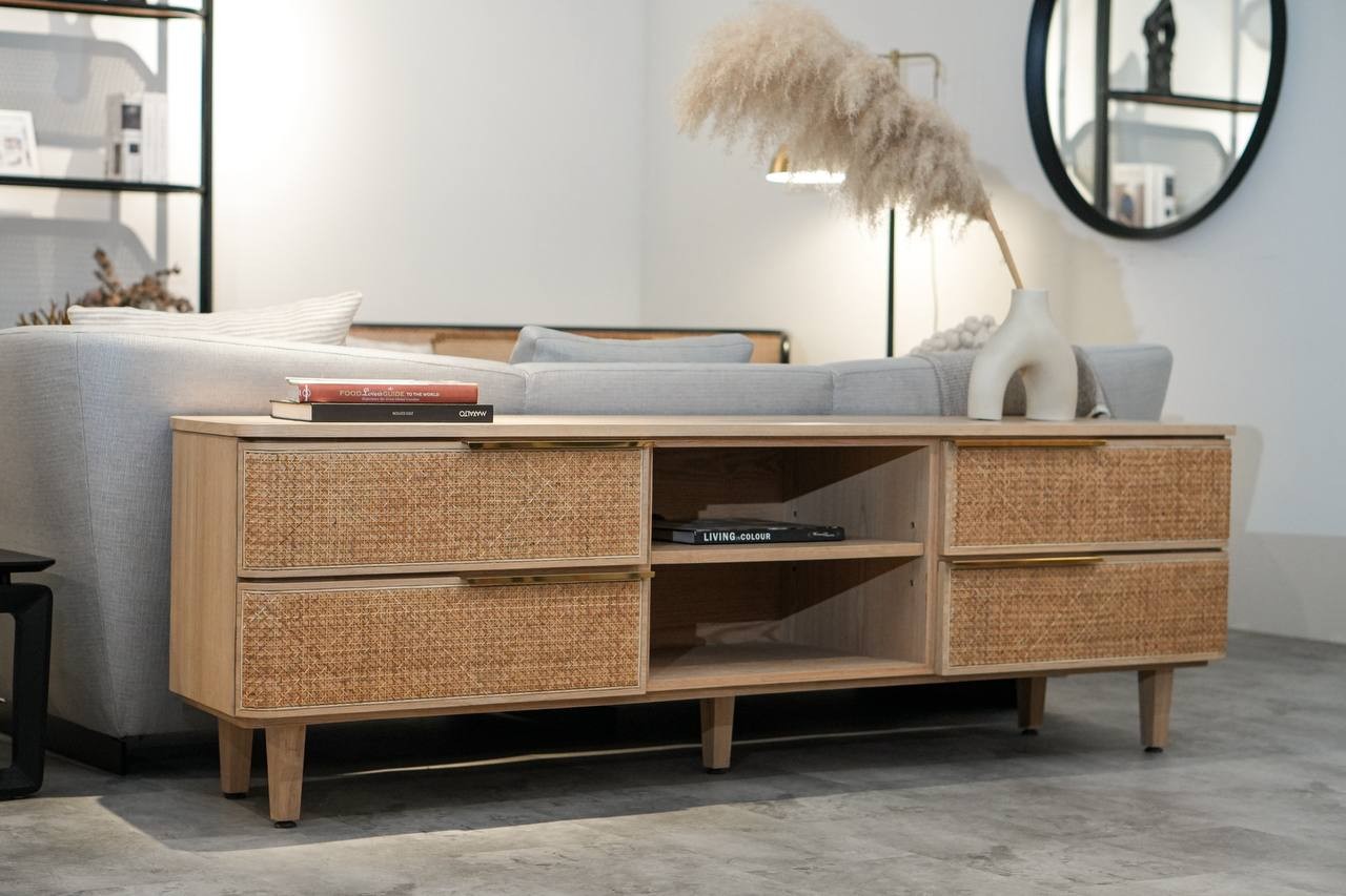 The Mooi designer TV Cabinet is here to save the day and provide you with an elegant, luxurious, yet functional storage solution that is delightful to look at! Its soothing facade is made out of ash veneer structure, natural hand woven rattan door covering, and gorgeous tinted gold trim handles as that subtle opulent detailing. This modern piece is sure to be the focal point and a feature furniture in your living space!