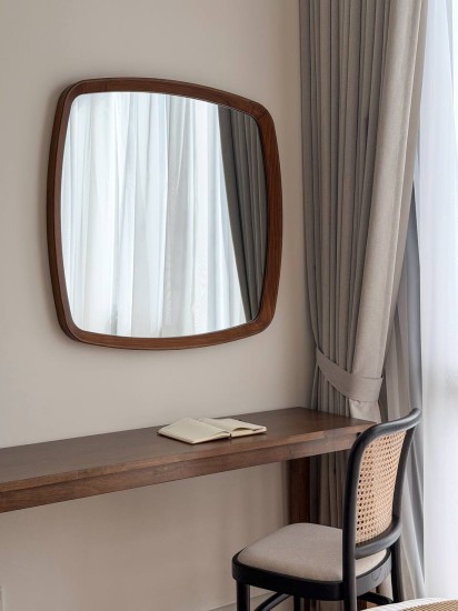 The Mix 6 Mirror, measuring 860mm, features a softly asymmetrical silhouette framed in solid wood with a warm walnut finish, or customised in your preferred colour from our selected range. Its gentle curves add a subtle sculptural touch, making it a refined accent for dressing corners, workspaces, and feature walls. Designed to reflect light while adding warmth and character to your space.