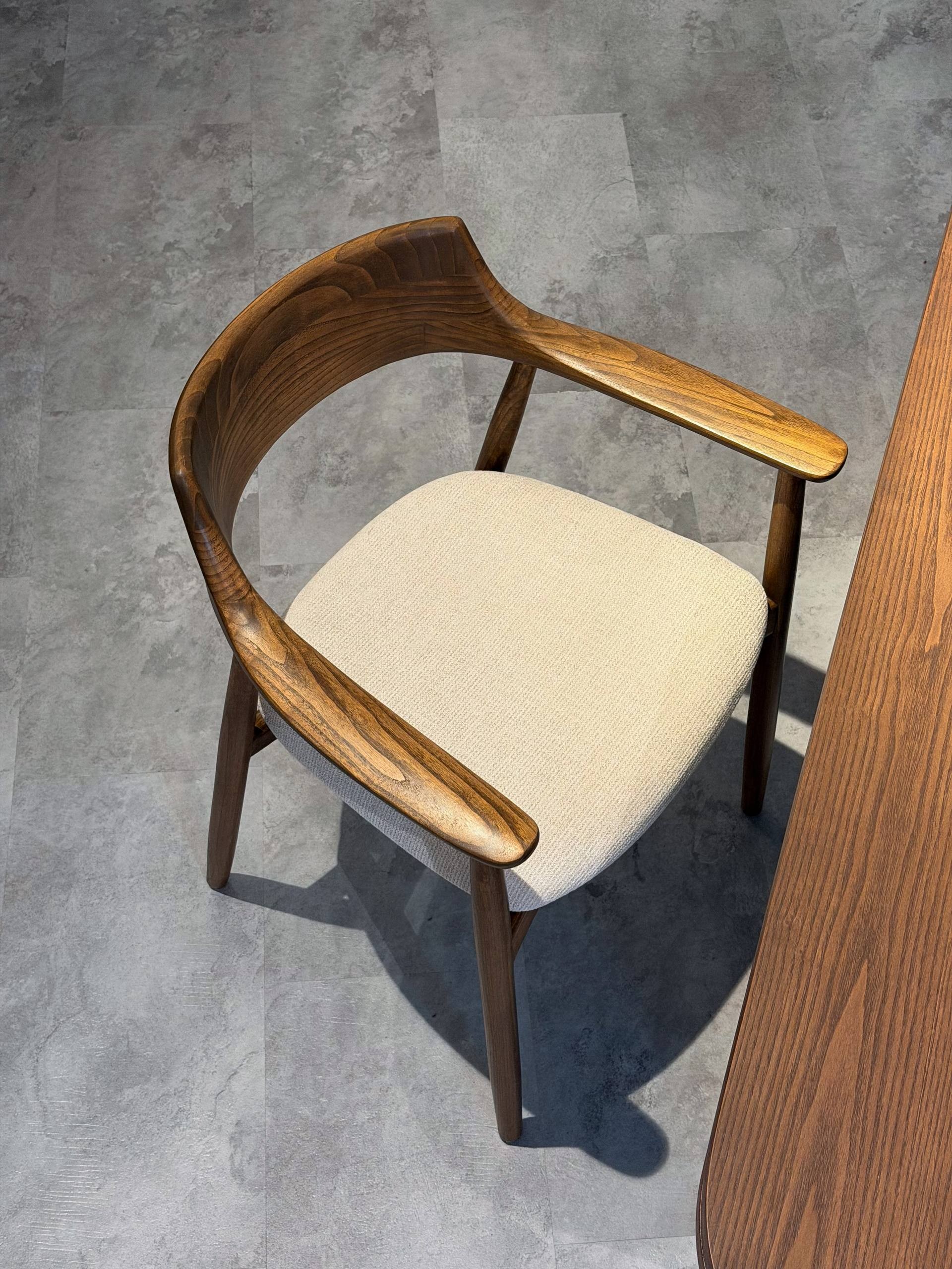 The Haruto Arm Chair effortlessly enhances the ambiance around your dining table, exuding a subtly elevated and inviting feel. Crafted from solid Ash wood, its sturdy structure provides a reliable base for the seat, upholstered in your preferred fabric for a personalized touch. Experience comfort and style seamlessly intertwined with the Haruto Arm Chair.