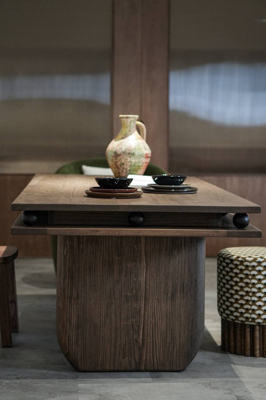 The Ladurée Table is a sculptural dining piece designed for modern organic living. Crafted from solid wood, its bold pedestal legs and rounded detailing create a sense of quiet strength and balance. The smooth rectangular top showcases the warmth of natural wood grains, making it perfect for family meals, intimate dinners, or stylish gatherings.