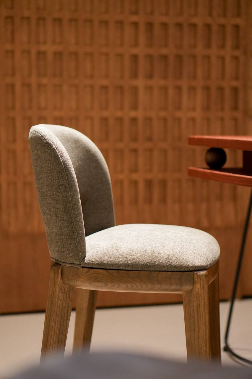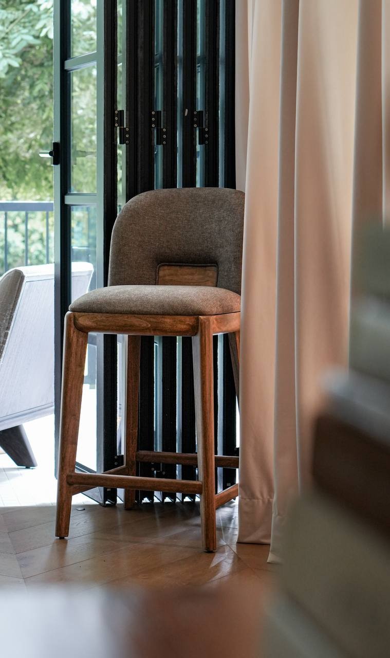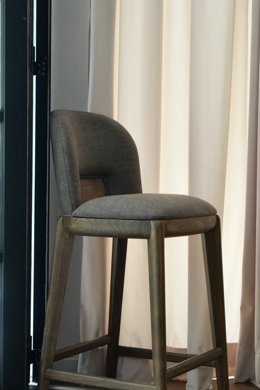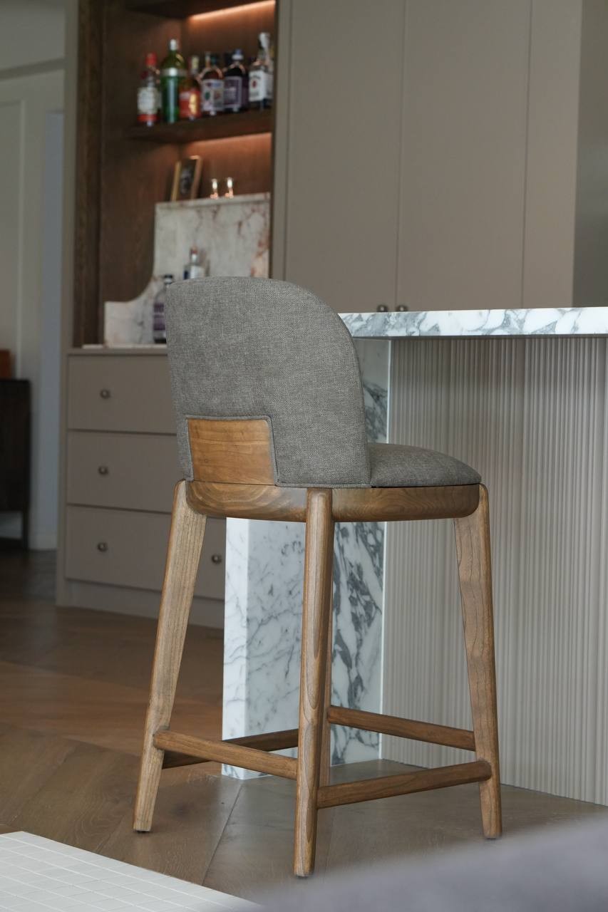 A defining feature of the Umi Barstool is its solid wood back panel — a beautifully sculpted detail that anchors the design with warmth and natural texture. This wooden accent adds depth to the form, balancing the softness of the fabric with the authenticity of timber craftsmanship. From every angle, the barstool reveals a harmonious blend of upholstery and joinery, making it visually striking in both kitchen islands and home bars.