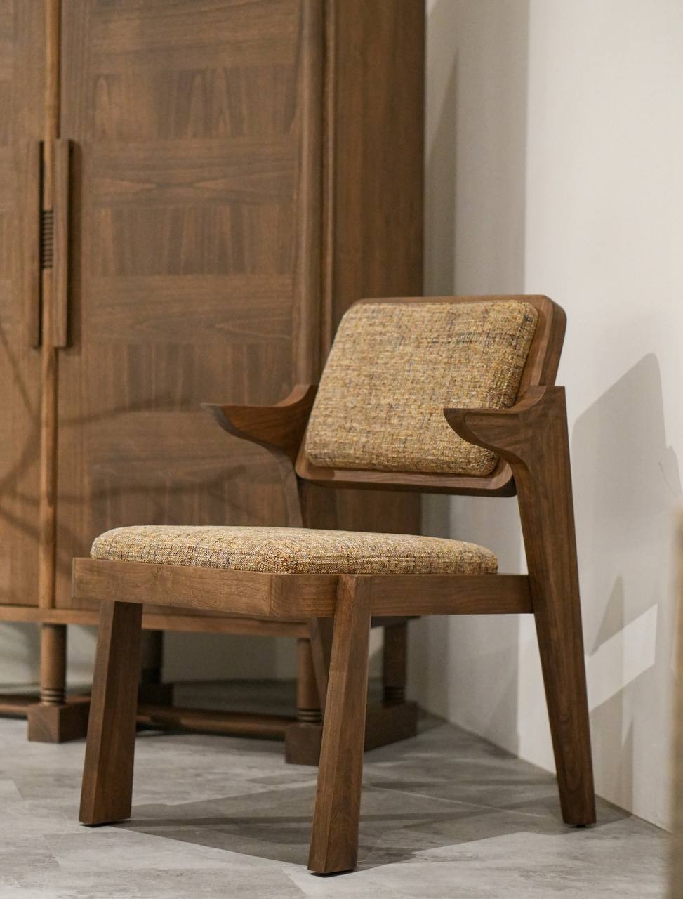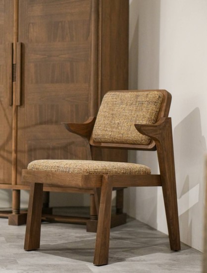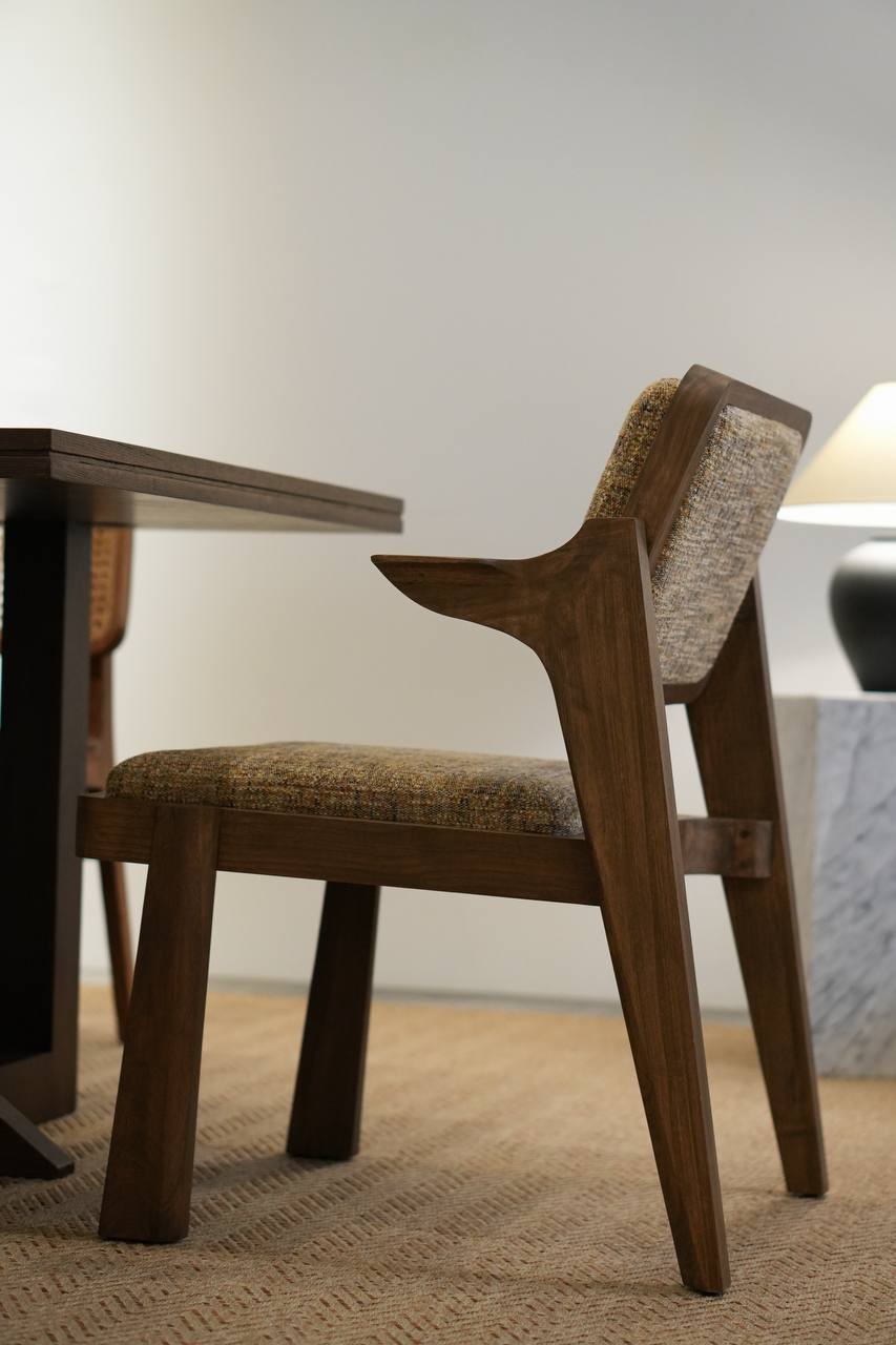 The upholstered seat and backrest are designed to support long, unhurried moments at the table, offering comfort without compromising visual clarity. Clean lines and refined joinery allow the materiality to speak revealing natural wood grain, softened edges, and a sense of quiet craftsmanship.