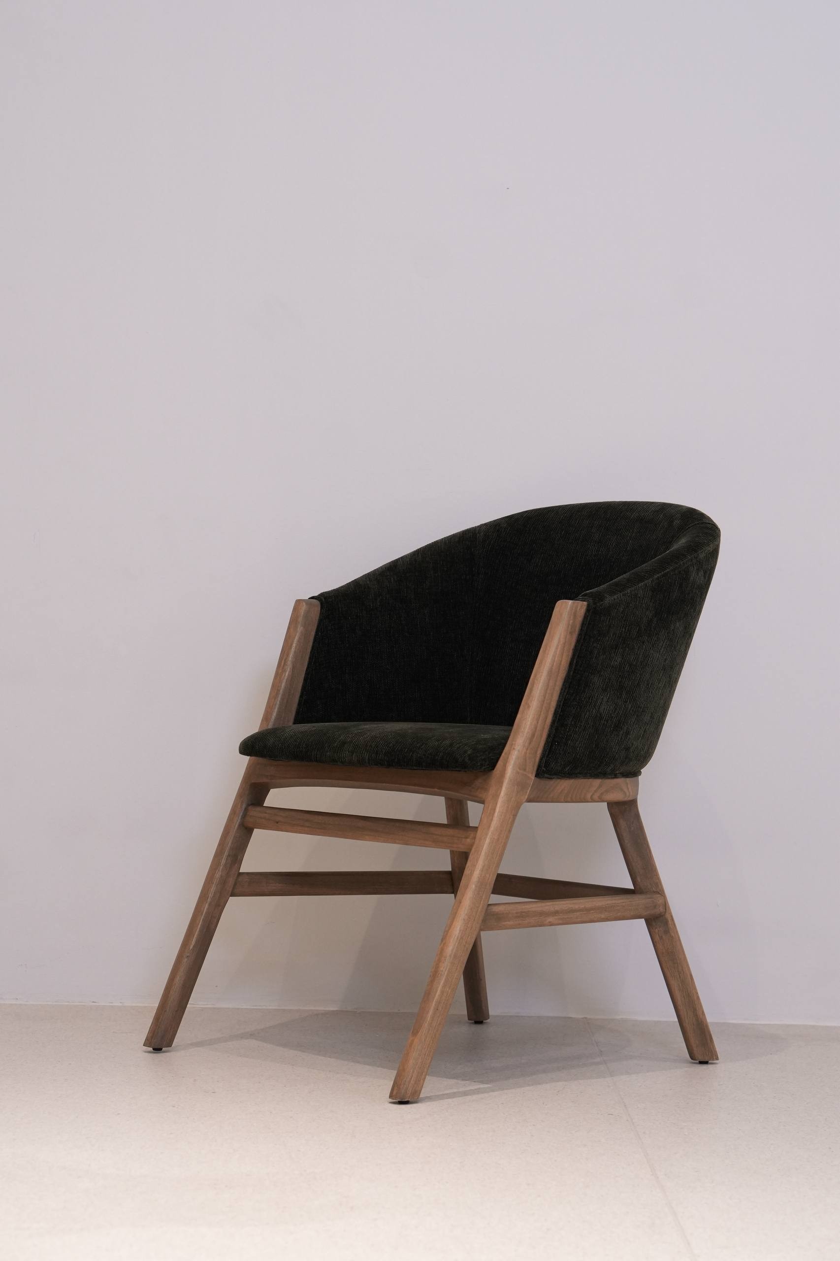 Crafted in solid wood, the frame carries a quiet strength, contrasted by the upholstered seat and back that soften the experience.