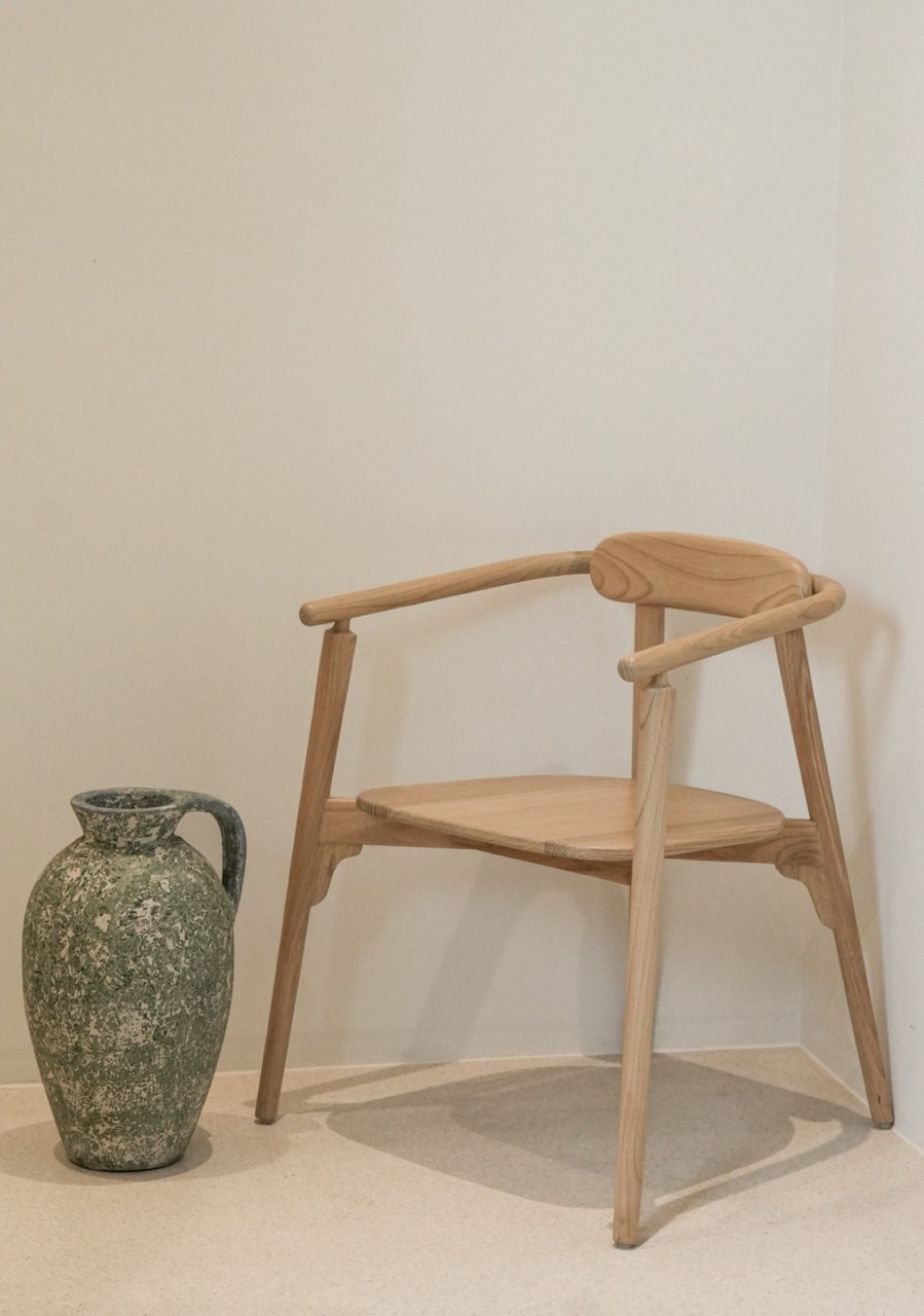 The Zen Chair is designed as a quiet expression of balance, comfort, and material integrity. Crafted from solid timber, its gently curved armrests flow seamlessly into the backrest, forming a continuous silhouette that supports the body while maintaining a light, composed presence.
